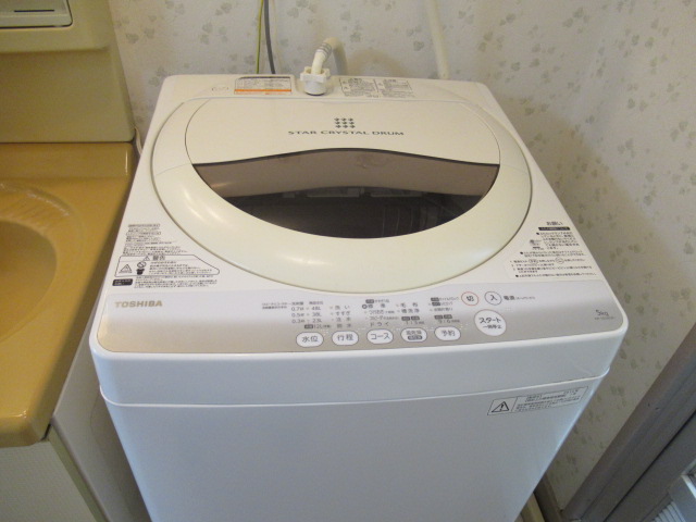 全自動洗濯機(東芝製)は洗面台の右側に設置されています。ご入居後すぐにご使用できます。洗濯機の上には広い棚が備え付けて有りとても便利です。