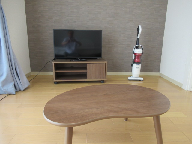 TVドアホン玄関側スイッチと室内のTVドアホン(Panasonic製)来客からの呼び出しがあると、自動で録画します。最大30件まで録画できます。画像、音声の録画、再生ができます。詳しくは室内に置いてある取扱説明書をご覧になり、各種設定をお願いします。家具家電付洋間7.5帖の画像です。TVはアクオスBS付き32型 ローテーブル 縦型掃除機もついています。カーテンは遮光カーテンとレースカーテンが付いています。